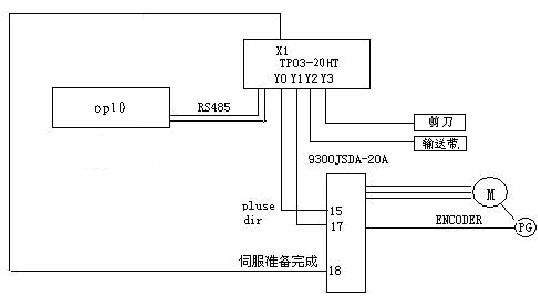 切紙機械是印刷和包裝行業(yè)常用的設(shè)備之一。切紙機完成的基本動作是把待裁切的材料送到指定位置,然后進(jìn)行裁切。其控制的核心是一個單軸定位控制。目前國內(nèi)進(jìn)行切紙設(shè)備進(jìn)給定位系統(tǒng)主要有兩種方式,一是利用PLC結(jié)合變頻器實現(xiàn),一是利用PLC結(jié)合伺服系統(tǒng)實現(xiàn),從效率上來說伺服相對變頻器要高很多。這次我們結(jié)合客戶設(shè)備的特點提出了一套方案,文本(OP10)+PLC(TP03-20HT)+伺服(JSDE-20A)進(jìn)行裁切參數(shù)設(shè)定和完成一些手動動作。